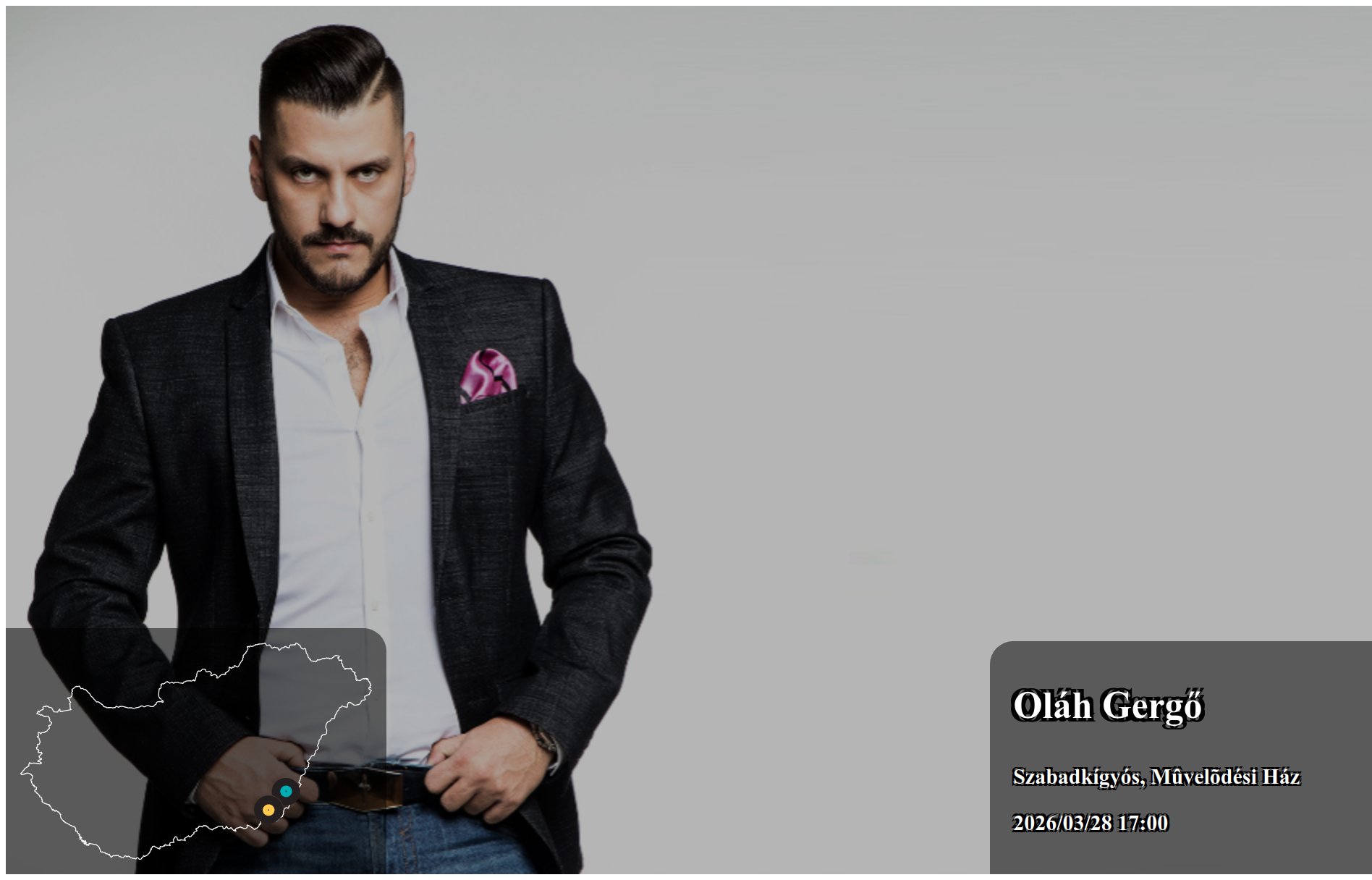 Az itt megjelenő eseményeket a produkció, vagy annak képviselője rögzítette. Az oldalon lévő információk valódiságáért a Koncertbooking.com ennek kapcsán felelősséget nem tud vállalni. Indulás előtt ellenőrizze az adott település vagy eseményhelyszín oldalán is a rendezvény paramétereit.